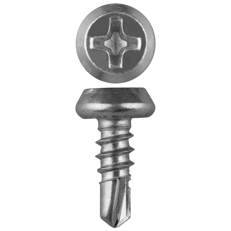 Саморез используется для крепления листов металла толщиной до 2 мм без предварительного сверления. Имеет полуцилиндрическую (усеченый конус) головку, крестообразный шлиц Phillips №2, наконечник - сверло, частую резьбу.