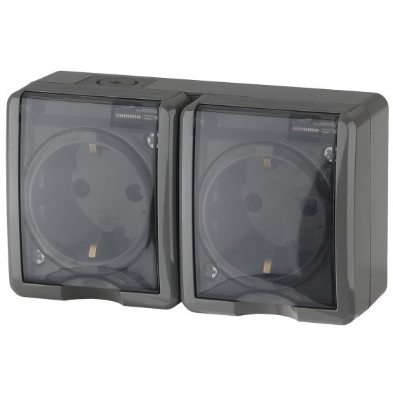 11-2403-03 ЭРА Розетка 2х2P+E IP54,16АХ-250В, ОУ, Эра Эксперт, серый (двухместная с заземлением)