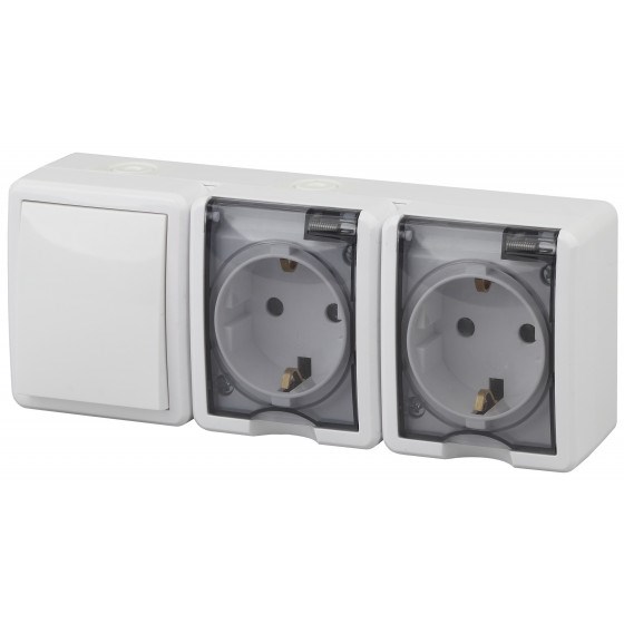 11-7403-01 ЭРА Блок две розетки+выключатель IP54, 16A(10AX)-250В, ОУ, Эра Эксперт, белый