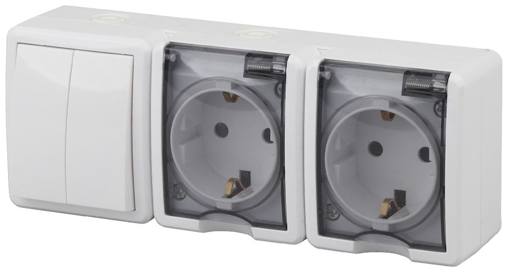 Блок две розетки+выключатель двойной IP54, 16АХ(10AX)-250В, ОУ, Эра Эксперт, белый