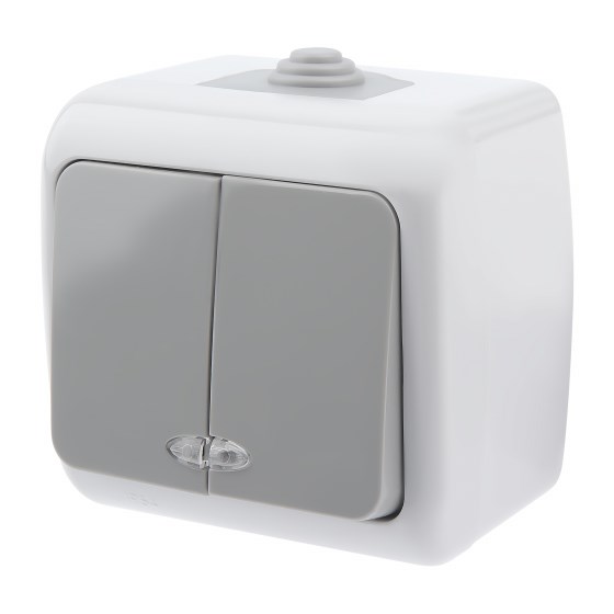 5-105-03 Intro Atlantic Выключатель двойной с подсветкой, 10А-250В, IP54, ОУ, серый