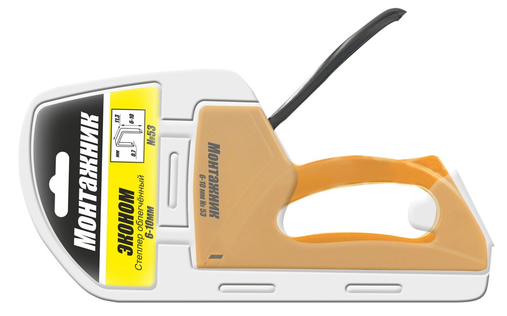 Cтеплер для скоб 6-10х0,7 мм "Монтажник" Эконом 600301 предназначен для крепления с помощью П-образных скоб высотой 6-10 мм (тип 53), к различным материалам, таких как панели ПВХ, ДВП, фанера, кабель и др.