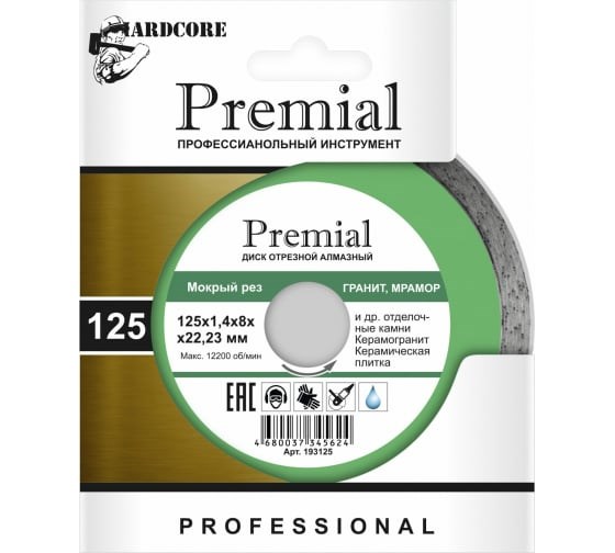 Диск алмазный отрезной сплошной Premial Гранит Hardcore 193125 применяется для мокрой резки различных отделочных камней.