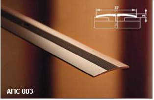 Профиль АПС 003 от производителя Мир Профиля изготовлен из алюминия и сверху покрыт полимерным или декоративным покрытием. Профиль представляет собой одноуровневый порог и имеет открытое крепление. Профиль предназначен для стыкового соединения напольных покрытий одного уровня. Для быстрой и легкой установки в комплект входят шурупы.