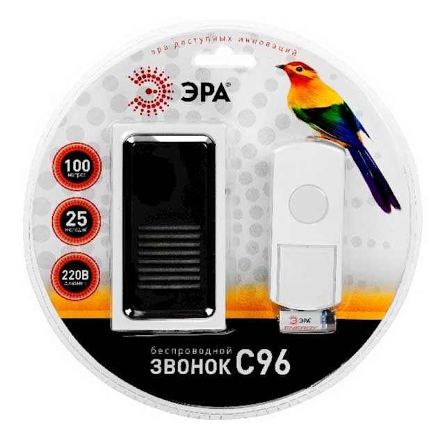 Беспроводной звонок ЭРА C96, от сети, новая упаковка Б0018973 работает от сети - встроенная вилка упрощает использование, позволяя за секунду подключать устройство в любом месте, где есть розетка. И переносить динамик из комнаты в комнату. Кнопка работает от батарейки А23, которая поставляется в комплекте. На выбор 6 качественных мелодий, их можно менять по настроению. Радиус действия звонка 100 метров. Компактный размер, универсальная для любого интерьера цветовая гамма. Аккуратная блистерная упаковка делает этот звонок отличным вариантом подарка на новоселье и другие праздники.