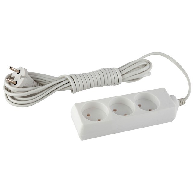 <p>Удобный бытовой удлинитель на 3 гнезда с удлинённым проводом 3 метра. Рассчитан для подключения простых бытовых приборов стандартной мощности. Максимальная нагрузка - 6 A/ 1300 Вт. Базовый белый цвет, аккуратный дизайн с закруглёнными углами. Для комфорта и безопасности гнёзда слегка «утоплены» в корпус. Изготовлен из надёжного полипропилена со специальными антипиренами, препятствующими горению.</p>