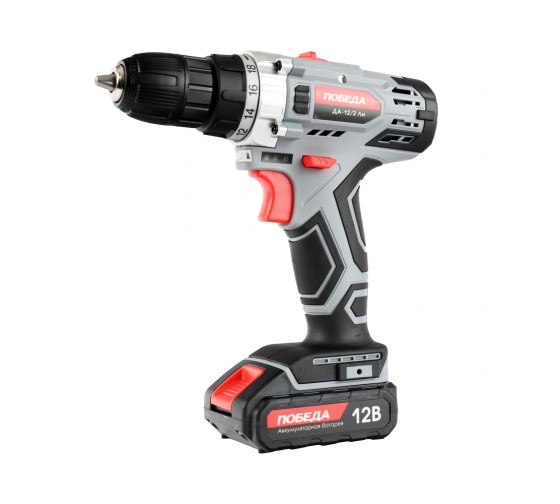 Аккумуляторная дрель-шуруповерт ПОБЕДА ДА-12/2 Ли 180201634 подходит для домашнего использования во время строительных или монтажных работ.