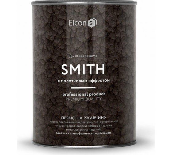 Быстросохнущая краска по металлу Elcon Smith с молотковым эффектом черная 0,8кг 00-00002864 предназначена для защитно-декоративной окраски металлических конструкций, кованых художественных изделий, промышленного оборудования, приборов, дверей, ворот с целью создания характерного узорчатого рисунка на поверхности окрашиваемых объектов, эксплуатируемых в атмосферных условиях и при перепадах температур от -60 °С до + 100 °С.