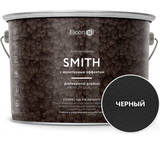 Быстросохнущая краска по металлу Elcon Smith с молотковым эффектом, черная 2 кг 00-00461474 предназначена для защитно-декоративной окраски металлических конструкций, кованых художественных изделий, промышленного оборудования, приборов, дверей, ворот с целью создания характерного узорчатого рисунка на поверхности окрашиваемых объектов, эксплуатируемых в атмосферных условиях и при перепадах температур от -60 °С до + 100 °С.