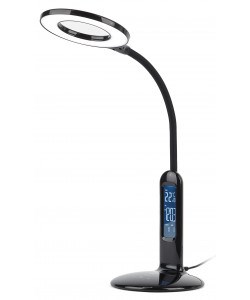 Настольный светильник ЭРА NLED-476-10W-BK черный Б0038592 со светодиодами (LED) в качестве источников света. У светильника сенсорное управление, плавный или ступенчатый (на выбор) диммер для регулировки яркости. 5 режимов цветовой температуры света: мягкий теплый свет, теплый свет, белый свет, дневной свет, холодный свет. Главное преимущество светильника - ЖК дисплей с функциями часов, будильника, календаря и термометра. Светильник сохраняет выбранные настройки света при включении-выключении. Высота плафона регулируется гибкой стойкой, направление света - поворотом плафона в любом направлении. Плафон кольцевой формы оптимально распределяет свет, это очень удобно и отлично подходит для мелкой ручной работы.