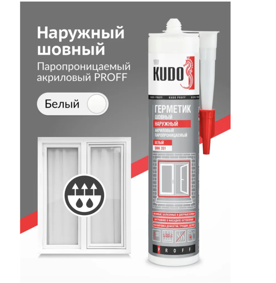 Высококачественный акриловый паропроницаемый герметик KUDO® PROFF предназначен для устройства наружного слоя монтажного шва в местах примыкания оконных блоков (включая балконные), дверных блоков и входных групп, витражных конструкций к проемам стен отапливаемых зданий гражданского и промышленного строительства с допустимой деформацией монтажного шва не более 15%.