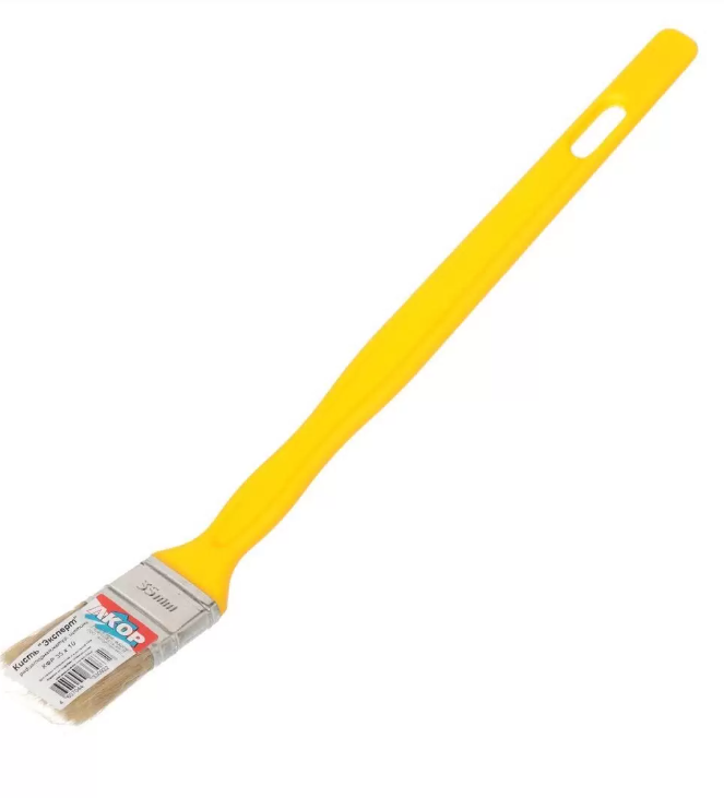 Плоская кисть Акор - ручной малярный инструмент с удлиненной пластиковой ручкой и со светлой натуральной щетиной. Используют для нанесения лакокрасочных материалов на поверхности радиаторов.