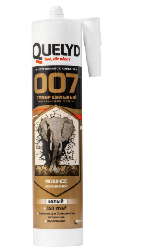 QUELYD монтажный клей-герметик 007 Супер Сильный 400 г Белый Высококачественный профессиональный монтажный клей-герметик с экстремально высокой начальной хваткой на основе SMP – технологий. Высыхание происходит при реакции с влагой воздуха, образуя прочное эластичное соединение.