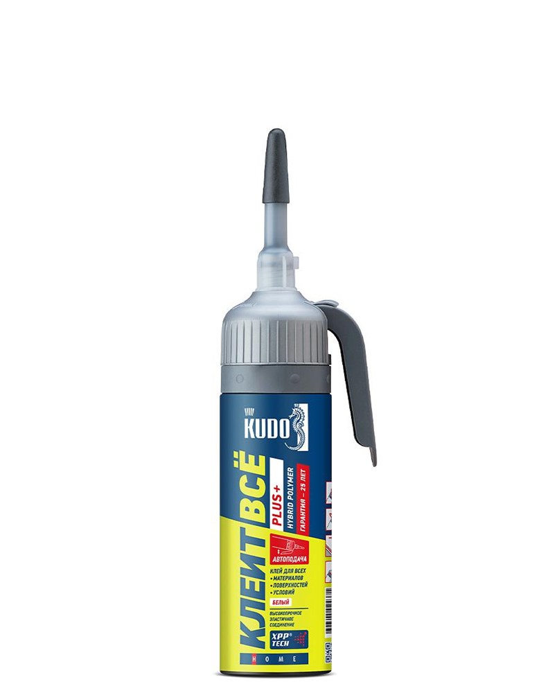 Клей-герметик предназначен для создания высокопрочных постоянно эластичных клеевых соединений и герметизирующих швов. KUDO «КЛЕИТ ВСЁ» PLUS+ используется для монтажа строительных и декоративных элементов (зеркал, подоконников, дверных порогов, систем кондиционирования и вентиляции, лестничных ступеней и т.п.) на бетонные, кирпичные, каменные, металлические, деревянные и другие поверхности (кроме поверхностей из полиэтилена, полипропилена и фторопласта).