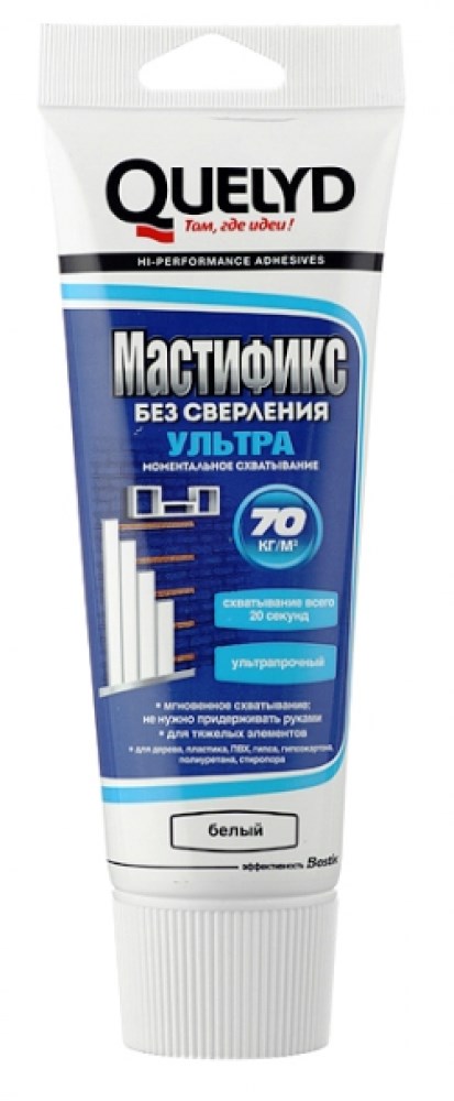 Акриловый монтажный клей «MASTIFIX ULTRA» (типа «жидкие гвозди») предназначен для крепления и приклеивания различных материалов как внутри, так и снаружи помещения. Поверхности, на которых могут производиться работы с помощью клея: дерево и его производные (ДВП, багеты, панели, наличники, бруски, лепные орнаменты, плинтуса, бруски, паркетные планки), пластмасса (коробки, панели из ПВХ, электрические розетки), металл (крепежные уголки, балки), пенополистирол, металл, камень, кирпич, зеркала.Преимущества:— ультрапрочное склеивание (70 кг/см2);— изначально повышенное схватывание;— незаменим при склеивании тяжелых материалов;— неровности до 5 мм сглаживаются после применения клея;— не имеет запаха;— не содержит в своем составе растворителя;— может подвергаться окрашиванию;— отличается высокой влагостойкостью;— устойчив к высоким температурам (от ?30°С до 130 °С).Технические характеристики:— в состав клея входят акриловые полимеры, наполнители и добавки;— время гуммирования отсутствует;— окончательная прочность с