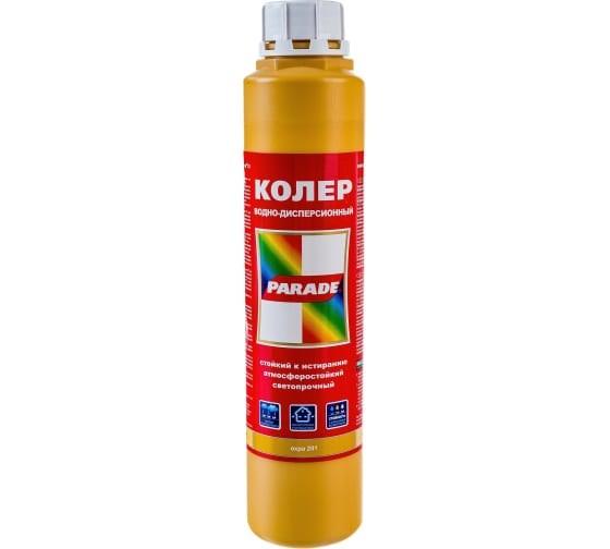 Колер PARADE №201 охра 0,75 л Россия - экологически чистый колер. Предназначен для тонирования всех видов красок, шпатлевок и декоративных штукатурок на водной основе. Для внутренних и наружных работ.