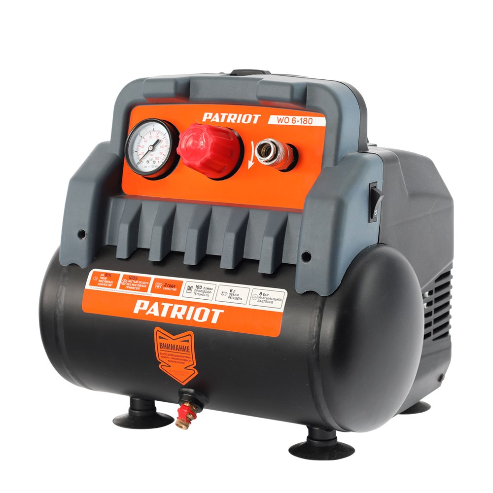 Важным преимуществом поршневого компрессора PATRIOT WO 6-180 является горизонтальное расположение резервуара для сжатого воздуха, так как это придает устройству отличную устойчивость и его вряд ли получится случайно опрокинуть. Модель не использует при работе масло, поэтому она выдает воздух без вредных примесей, не нуждающийся в дополнительной очистке.