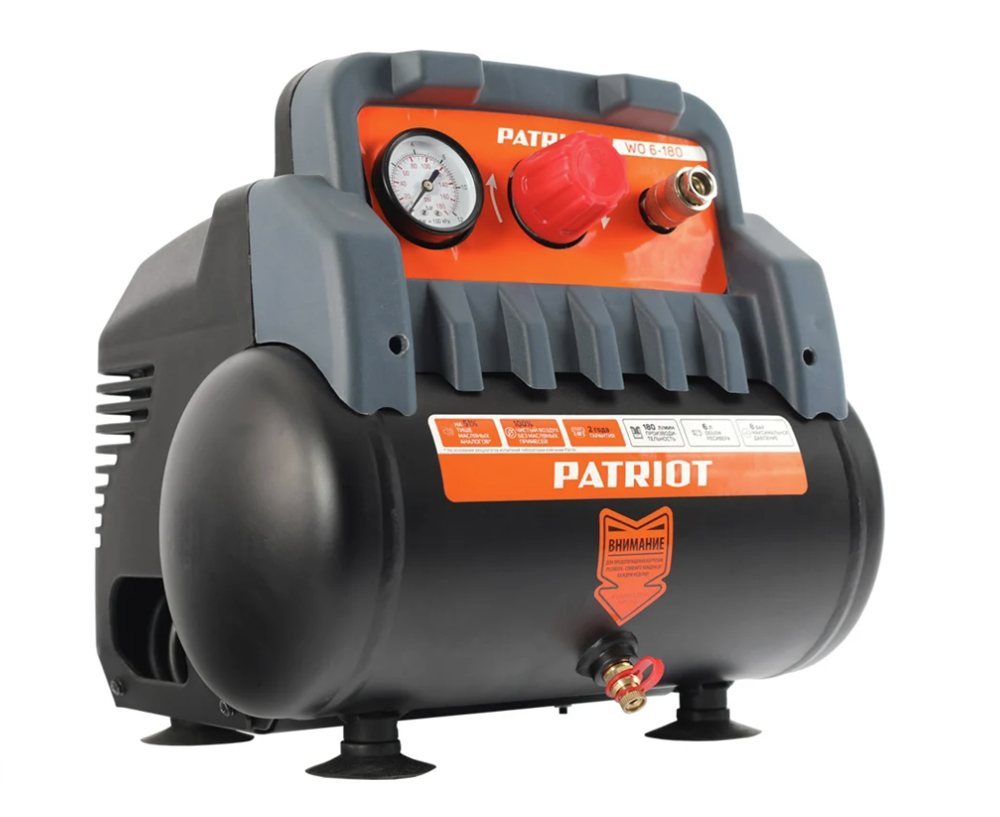 Важным преимуществом поршневого компрессора PATRIOT WO 6-180 является горизонтальное расположение резервуара для сжатого воздуха, так как это придает устройству отличную устойчивость и его вряд ли получится случайно опрокинуть. Модель не использует при работе масло, поэтому она выдает воздух без вредных примесей, не нуждающийся в дополнительной очистке.
