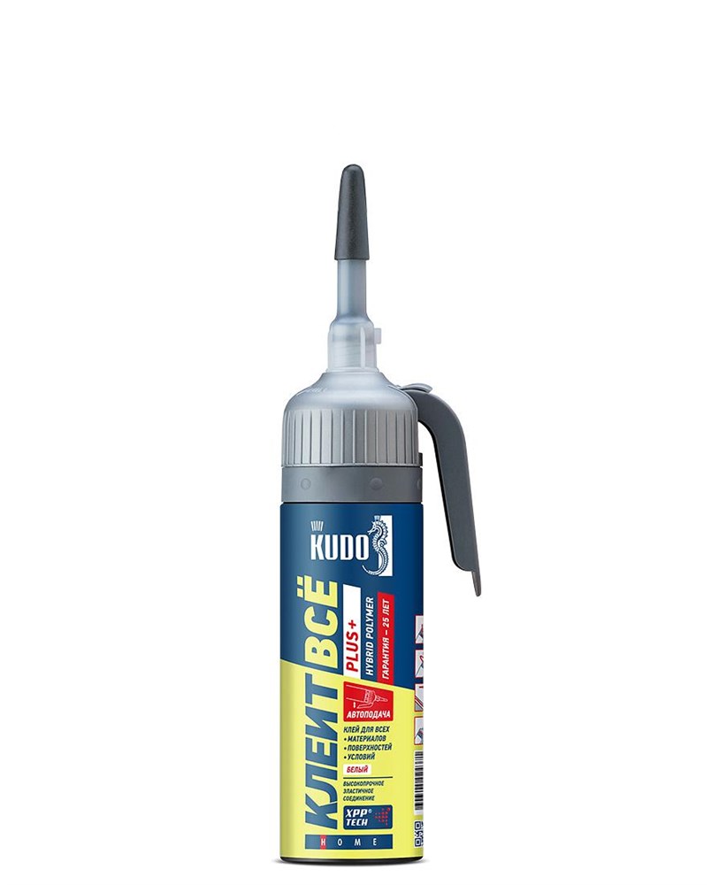 Клей-герметик предназначен для создания высокопрочных постоянно эластичных клеевых соединений и герметизирующих швов. KUDO® «КЛЕИТ ВСЁ» PLUS+ используется для монтажа строительных и декоративных элементов (зеркал, подоконников, дверных порогов, систем кондиционирования и вентиляции, лестничных ступеней и т.п.) на бетонные, кирпичные, каменные, металлические, деревянные и другие поверхности (кроме поверхностей из полиэтилена, полипропилена и фторопласта). Прозрачный гибридный клей-герметик рекомендуется для сборки стеклянной мебели, крепления небольших стёкол и зеркал, молдингов, плинтусов в местах, где важен прозрачный клеевой шов.
