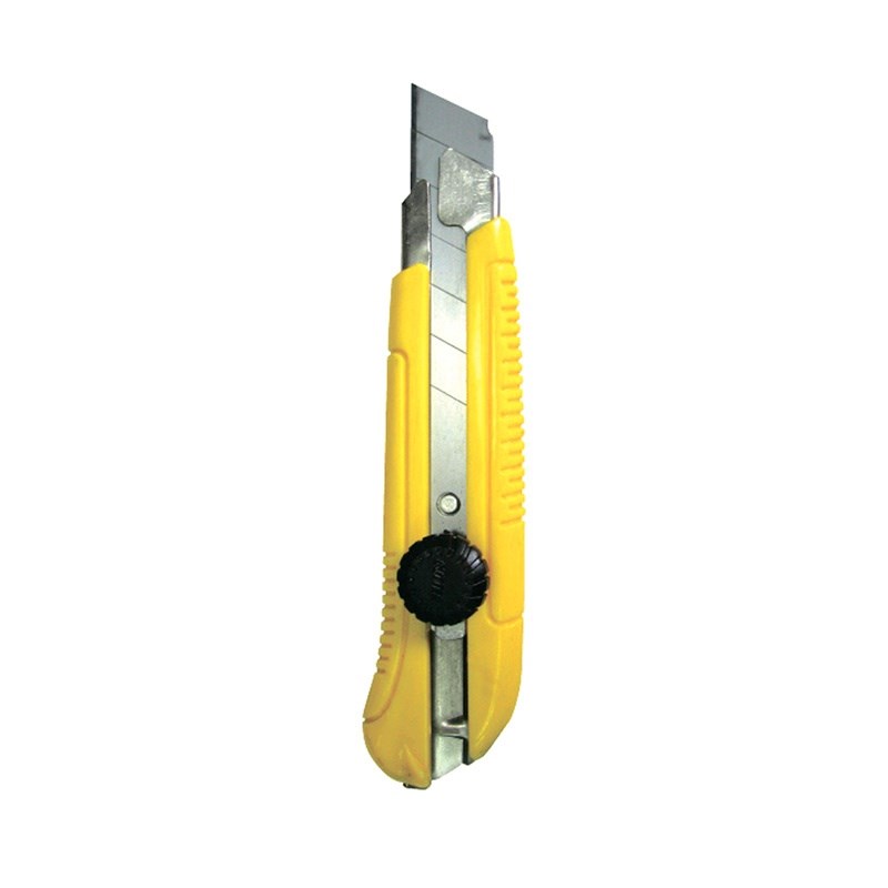 Предназначен для резки бумаги, картона, ткани и пластика. Пластиковый корпус. Металлическая направляющая. Оснащен отламывающимся сегментированным лезвием.