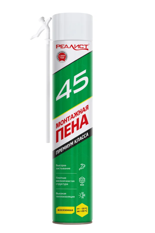 Премиальная бытовая монтажная пена нового поколения REALIST Green 45л - всесезонная - это ультра быстрое застывание и высокая производительность.
