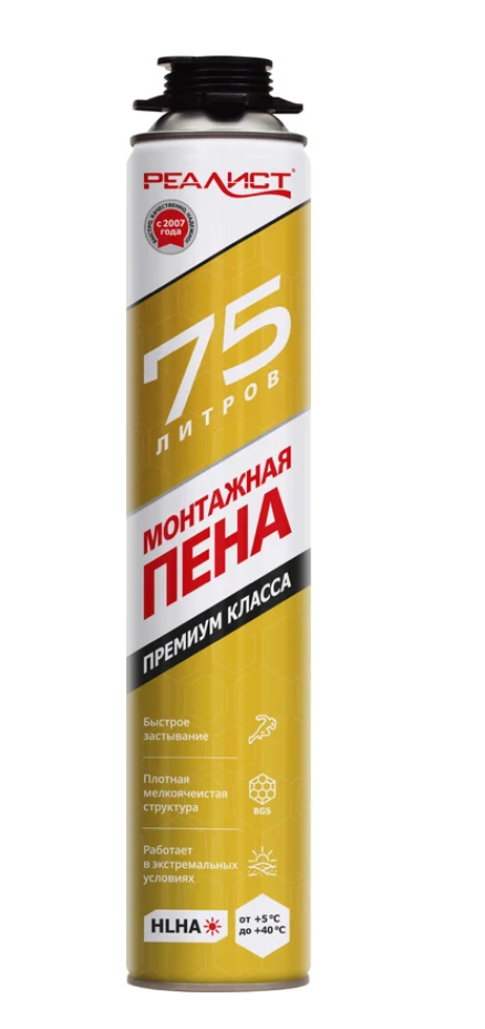 Пена монтажная REALIST PRO Gold 75 л 4680287563397 - это ультра быстрое застывание и высокая производительность. Разработана с учетом экстремальных климатических условий применения и требований профессионалов. Монтажная пена REALIST максимально вспенивается на выходе из ствола пистолета, удобно укладывается в шов, максимально расширяется на начальном этапе, заполняя все неровности монтажного шва, и минимально расширяется на последнем этапе застывания.
