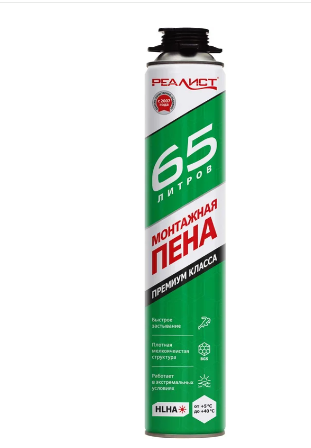 Пена монтажная REALIST PRO Green 65 л 4602009041020 - это ультра быстрое застывание и высокая производительность. Разработана с учетом экстремальных климатических условий применения и требований профессионалов. Монтажная пена REALIST максимально вспенивается на выходе из ствола пистолета, удобно укладывается в шов, максимально расширяется на начальном этапе, заполняя все неровности монтажного шва, и минимально расширяется на последнем этапе застывания.