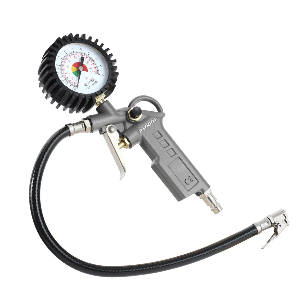 Клавиша пуска располагается непосредственно на рукояти, что обеспечивает удобную эксплуатацию пистолета для накачки шин с манометром PATRIOT GN 60D 830901020.