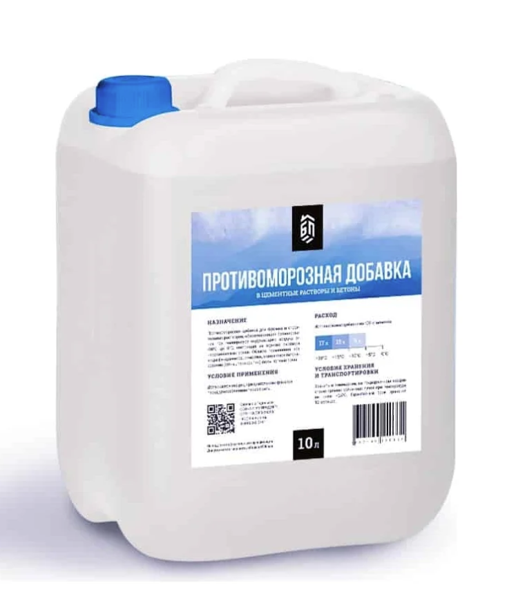 Противоморозная добавка в строительные растворы БИТУМ ПРОДУКТ 10 л BP-01 - добавка для бетонов и строительных растворов, обеспечивающая бетонирование при температуре окружающего воздуха от -25°С до 0°С.