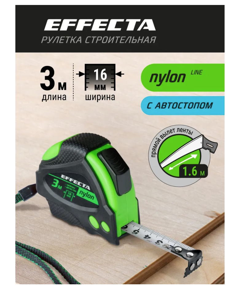 Рулетка 3мх16мм Fomeron "EFFECTA NYLON" с магнитом, автостопом, лентой нейлон (12шт/уп)