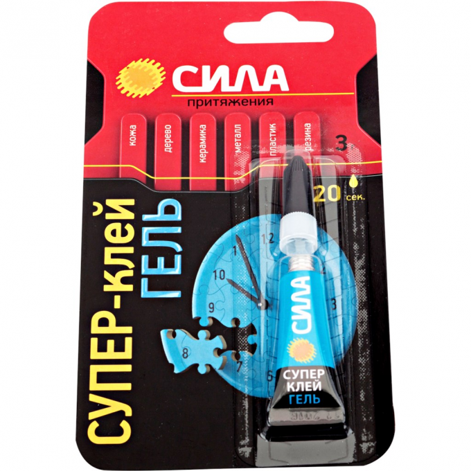 Супер-клей ГЕЛЬ СИЛА, идеально подходит для быстрого и эффективного ремонта различных предметов мебели, интерьера, обуви и т.д. Накрепко схватывает дерево, кожу, резину, керамику, фарфор и пластик, при этом супер клеи экономично расходуются и высыхают за несколько секунд. Не растекается и не капает. Д