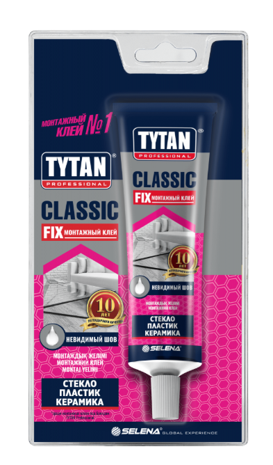 Клей монтажный Prof Classic Fix марки Tytan Professional представляет собой многоцелевой клей широкого спектра действия на основе каучука. Применяется для ремонтных, монтажных, работ. Отличается высокой влагостойкостью, повышенной адгезией к большинству типов строительных оснований: бетон, металл, кирпич, штукатурка, древесина, пластик. После отвердения образуется прозрачный, эластичный шов. Используют Prof Classic Fix для приклеивания элементов конструкции из ПВХ, древесины, полиуретана, металлов между собой и к различным основаниям.