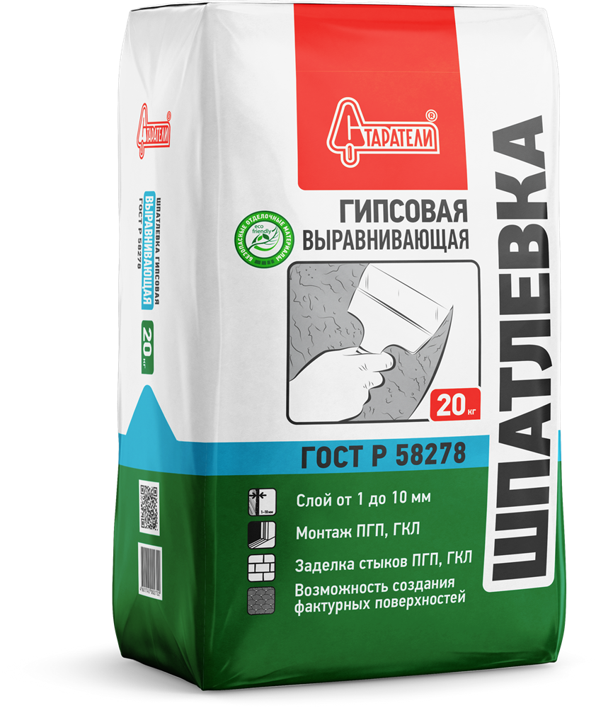 ГОСТ Р 58278 Для выравнивания стен и потолков внутри помещений с нормальным уровнем влажности. Идеально подходит для монтажа перегородок из ПГП; заделки стыков ГКЛ, ГВЛ с использованием армирующей ленты; приклеивания ГКЛ, ГВЛ к ровным минеральным поверхностям; заделки повреждений и головок саморезов на поверхности ГКЛ, ГВЛ; заполнения стыков сборных бетонных элементов; склеивания и шпатлевания гипсовых элементов (лепнины); создания декоративных фактурных поверхностей.