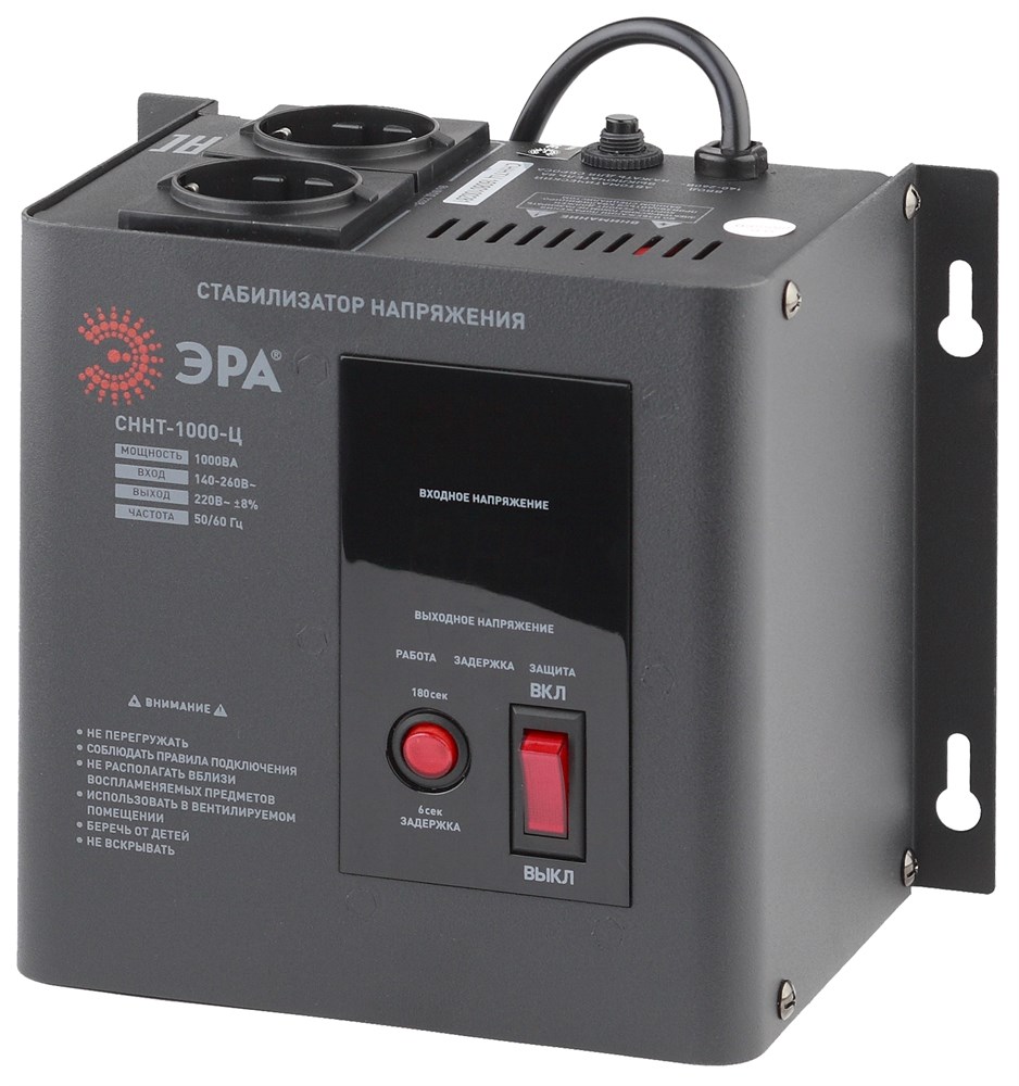 Стабилизатор напряжения настенный однофазный релейный цвет чёрный модели СННТ-1000-Ц. Номинальные характеристики (полная мощность / диапазон входного напряжения): 1000ВА 140-260В . Предназначен для поддержания стабильного однофазного напряжения питания бытовых приборов при отклонениях значений сетевого напряжения. Выбирая стабилизатор, нужно знать, какое электрооборудование будет к нему подключено: один прибор, группу приборов (наиболее чувствительных к перепадам напряжения в сети) либо вся домашняя (офисная) техника. Затем необходимо рассчитать суммарную мощность защищаемых электропотребителей. Основное условие выбора мощности стабилизатора напряжения - суммарная мощность подключаемой к нему нагрузки не должна превышать полной мощности самого стабилизатора (в противном случае автоматика стабилизатора будет их просто отключать). Точные значения мощности можно узнать из паспортных данных Вашего конкретного потребителя. Стабилизатор подбирается с запасом в 25-30% к его полной мощности.