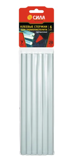 Клеевые стержни SGS72006 прозрачные 7x200 мм, 6 шт для термопистолета СИЛА Б0057685 предназначены для использования в термопистолетах с диаметром 7 мм для склеивания различных материалов в любых сочетаниях: бумага, картон, дерево, бытовой пластик, металл, бетон, ткань, стекло.