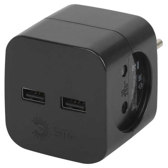Тройник (адаптер) ЭРА с 2-мя розетками и 2-мя USB гнездами для зарядки портативных устройств. Идеален для зарядки мобильных телефонов и планшетов. Особенно актуален, когда в помещении мало источников подключения - можно из одной розетки сделать две и при этом ещё заряжать 2 устройства одновременно через USB. Максимальная мощность USB разъемов: 2400 мА.