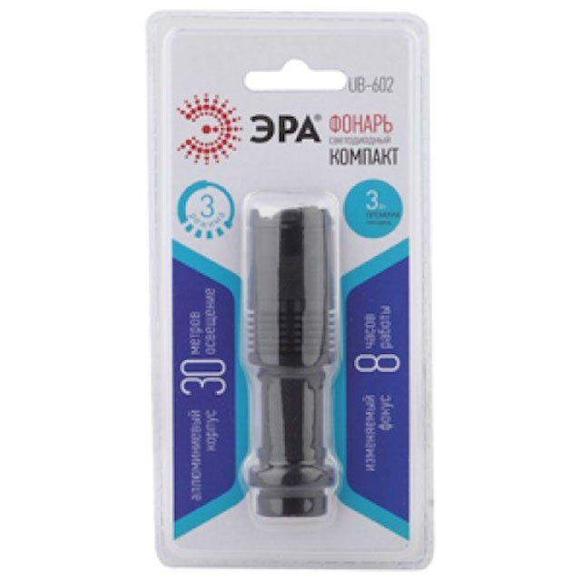 Фонарь UB-602 ЭРА универс. "Компакт" [3 Вт, 1xAA, алюм, регул. фокус, 3 режима, прищепка, бл