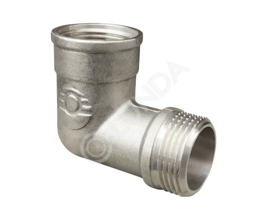 Угольник с переходом на наружную резьбу - угловой латунный никелированный фитинг, который позволяет соединить две трубы под прямым углом.