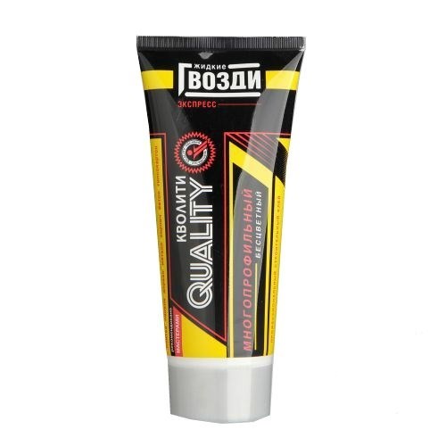 Жидкие гвозди «Quality» экспресс – профессиональный строительный клей – современная альтернатива привычным металлическим гвоздям, шурупам и дюбелям.Назначение: для приклеивания изделий из пенополистирола, стеновых панелей, пробки, дерева / доски, кафельной плитки, ДСП, МДФ, металла, гипса, кирпича, гипсокартона, цемента, декоративного камня, пр.Состав: поливинилацетатные полимеры, наполнитель.Цвет: прозрачныйСвойства:• время первоначального схватывания 15 минут• сила схватывания 90 кг/кв.м.• расход – 15 м (при нанесении сплошным слоем при диаметре среза носика 6 мм), температура применения от -10 до 30 °С• рекомендуемая — не ниже 15°С.• морозоустойчивость – допустимо замораживание без потери клеящих свойствУказание по применению:1. Склеиваемые поверхности должны быть сухими, чистыми, обезжиренными, хотя бы одна из поверхностей должна обладать способностью впитывания.2. Клей наносится на одну из склеиваемых поверхностей либо сплошной полосой, либо точечно.3. Склеиваемые поверхности сильно прижать друг к друг